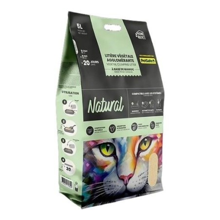 Litière végétale agglomérante, 100 % naturelle et biodégradable, pour une absorption optimale et une neutralisation efficace des odeurs.