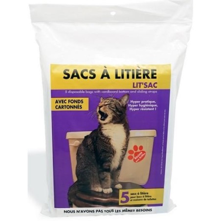 Pochette de 5 sacs petit format pour bac de litière avec fond cartonné et lien coulissant Les sacs LIT’SAC PETIT MODÈLE sont parmi les produits les plus résistants du marché. En plastique blanc d’une bonne épaisseur, ils sont munis d’un fond cartonné résistant aux griffes et d’un lien coulissant pour une fermeture rapide du sac. Vendus par pochette de 5, ces sacs sont hygiéniques et vous permettent de conserver la propreté de votre litière ou maison de toilette.Facile à mettre en place et à retirer, les sacs LIT’SAC PETIT MODÈLE rendent le nettoyage du bac inutile et le changement de litière rapide. Avec ce produit de très bonne qualité les contraintes liées à la litière ont disparu. Vous pourrez donc profiter pleinement de votre chat !Fermeture rapideLiens coulissantsFond carré adapté aux bacs de litière pour chat 39 cm X 23 cmRésistant au griffuresÉpaisseur du plastique 40 µm (résistant)Poids d’une pochette 0,25 kgAchat minimum de 5 pochettes de 5 sacs chacune