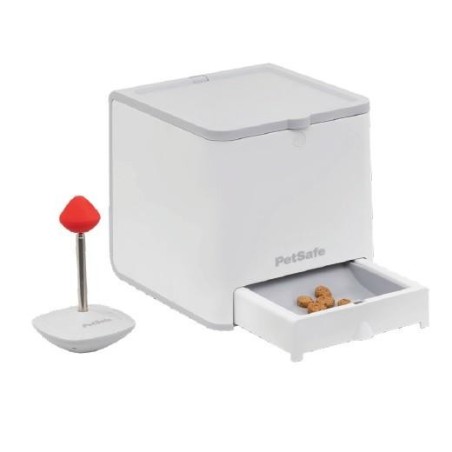 Distributeur de friandises pour chienLe dispositif d’éducation positive Teach & Treat est un système de récompense télécommandé à distance. Allié indispensable de l’éducation positive, la télécommande permet d’activer la distribution de la récompense jusqu’à 27 mètres de distance. Ce système d’aide à l’éducation permet d’enseigner facilement les ordres de base : assis, couché, au panier... Mais également de répondre à des problématiques d’éducation, telles que le chien qui saute sur les invités, qui aboie ou encore qui ne veut pas descendre du canapé. Également équipé d’une cible télescopique amovible, le Teach & Treat enseigne au chien à se concentrer sur le maître ou sur l’endroit indiqué, pour apprendre des consignes de façon ludique et motivante : il accompagne parfaitement les séances d’agility par exemple.Un distributeur de friandises règlables pour chatLe distributeur dispose d’un interrupteur de réglage pour distribuer une ou plusieurs récompenses à la fois, avec ou sans signal sonore ; d’un interrupteur de volume pour contrôler le signal sonore et d’une molette de réglage déterminant l’intervalle de temps de distribution. Le distributeur peut contenir jusqu’à 700 ml de croquettes ou de friandises ; deux disques interchangeables, de petite ou grande taille, permettent de s’adapter à la taille des croquettes.Un guide de démarrage aide le client à utiliser le produit et des cours au format vidéo, dispensés par une éducatrice, accompagnent l’utilisateur dans ses séances d’éducation.