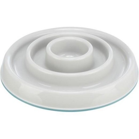 La gamelle plastique Slow Feeding pour chiensCette gamelle pour chien est dotée d’un fond en spiral permettant de ralentir la prise de nourriture de votre animal de compagnie. Cela encourage votre animal à manger plus lentement favorisant ainsi sa digestion. L’assiette est fabriquée en plastique robuste et possède un anneau en caoutchouc antidérapant.Dimension : 0,45L / 23 cm de diamètre