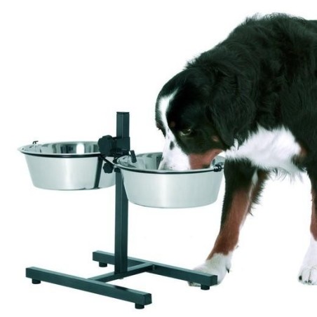 Support double gamelle pour chien avec hauteur réglable jusqu’à 40 cm, favorisant une meilleure digestion et réduisant le risque de torsion d’estomac.