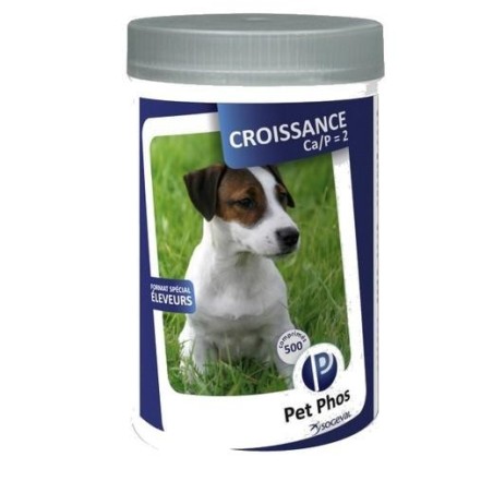 Complément alimentaire pour chiot : Pet Phos croissance CA/P=2Ce complément alimentaire pour chiot est également recommandé pour les chienne en lactation nourries avec une alimentation ménagère carencée en calcium.