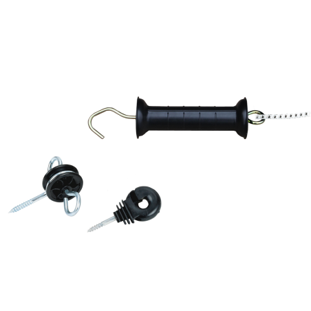 Kit portail en acier galvanisé pour une conductivité optimale du courant, comprenant une poignée, un élastique extensible jusqu'à 6 mètres, un isolateur et un ancrage.