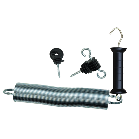 Cette poignée de portail est équipée d'un ressort de 5 cm de diamètre pouvant être étiré jusqu'à 5 mètres, et est livrée avec deux ancrages.
