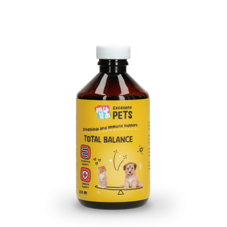 Excellent Pets Total Balance est un complément liquide pour chiens et chats conçu pour soutenir la croissance, favoriser le bon fonctionnement intestinal et stimuler le système immunitaire.