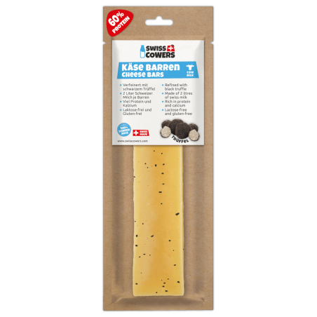 Les barres de fromage SwissCowers à la truffe noire sont des bâtonnets de fromage enrichis en véritable truffe noire, spécialement conçus pour les chiens.