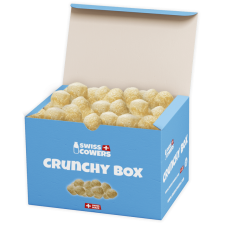 Ces Cheese Crunchies sont fabriqués à partir de barres de fromage SwissCowers, coupées en petits morceaux et cuites à la main. Riches en protéines et en calcium grâce au lait suisse, ces friandises sont 100 % naturelles et sans gluten, lactose ni conservateurs. Chaque croquant mesure entre 2 et 3 cm de diamètre.