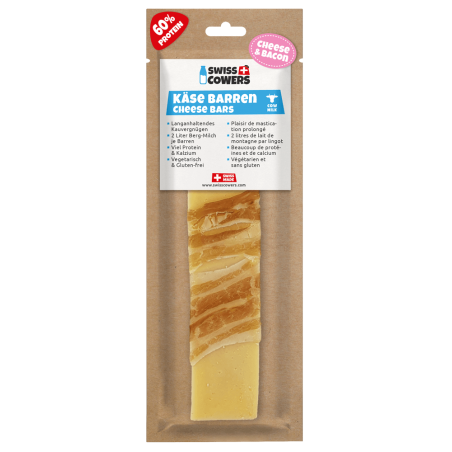 Les barres de fromage Swiss Cowers au bacon sont une délicieuse friandise pour votre chien, fabriquée avec des ingrédients de qualité suisse.