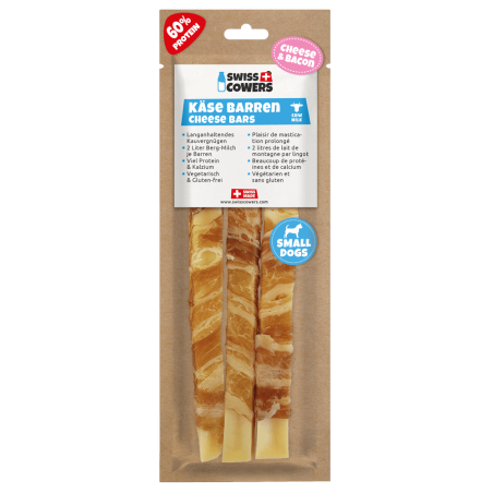Les barres de fromage Swiss Cowers au bacon sont une délicieuse friandise pour votre chien, fabriquée avec des ingrédients de qualité suisse.