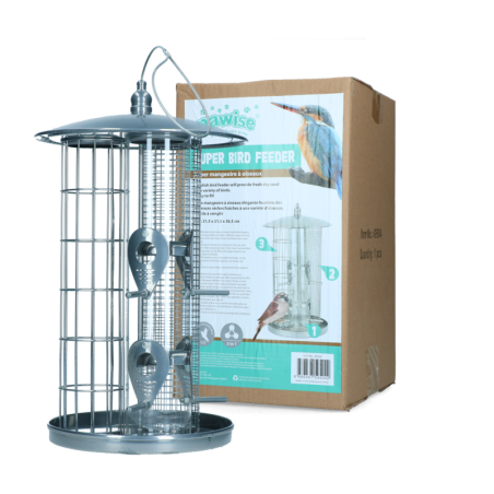 Les dimensions de cette mangeoire sont de 21,5 x 21,5 x 36,5 cm. Pour une utilisation optimale, placez-la dans un endroit calme et à l'abri des prédateurs. Remplissez les compartiments avec des boules de graisse, des cacahuètes et des graines pour attirer une grande variété d'oiseaux dans votre jardin.