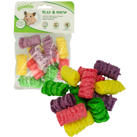 Ces jouets à mâcher sont disponibles en deux tailles différentes : petit (4 x 2,5 cm) et grand (12 x 2,5 cm), et sont proposés dans des couleurs assorties. Ils sont spécialement conçus pour offrir une expérience de jeu et de mastication agréable à votre animal de compagnie. Fabriqués avec des matériaux sûrs pour les rongeurs, ces jouets contribuent à l'hygiène dentaire en aidant à user naturellement les dents de votre animal.
